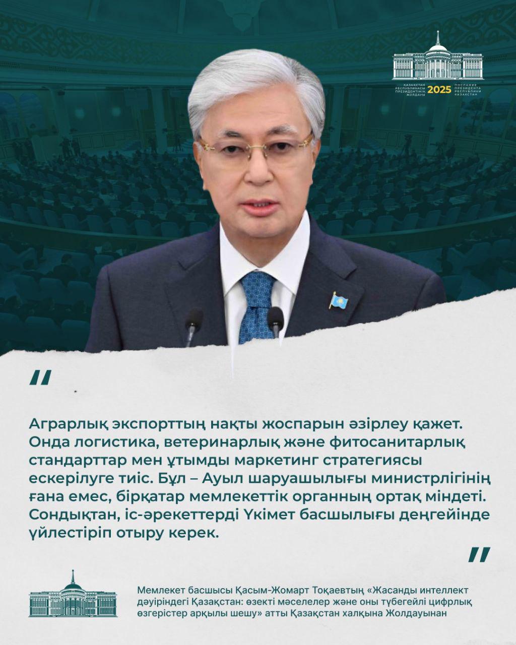 Жолдауда айтылғандай, ауыл шаруашылығы өнімдерін сыртқы нарыққа шығару үшін тек өндіріс көлемін арттыру жеткіліксіз. Бізге логистиканы жақсарту, ветеринарлық және фитосанитарлық талаптарды нақты сақтау, өнімдердің сапасын халықаралық стандарттарға сәйкестендіру қажет.