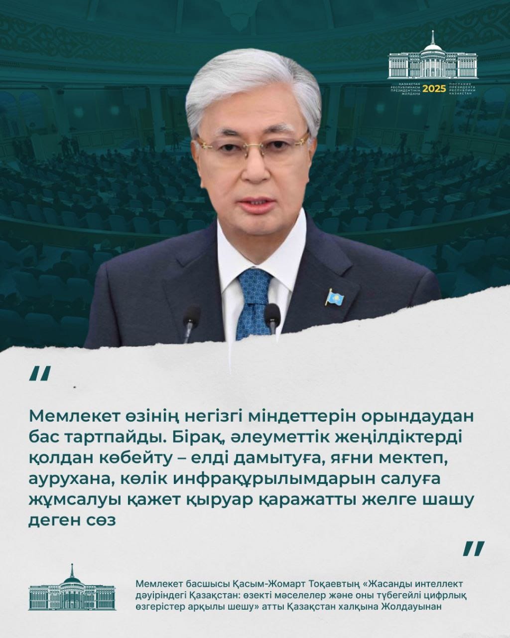 Мемлекет басшысы Қасым-Жомарт Кемелұлы Тоқаевтың Жолдауындағы «әлеуметтік жеңілдіктерді орынсыз көбейту – қаржыны желге шашумен тең» деген сөзі елдің даму бағытын айқындап, нақты ұстанымды көрсетті. Шынында да, мемлекеттің басты міндеті – халықтың әл-ауқатын арттырып, сапалы білім мен денсаулық сақтау жүйесін жетілдіру, жол және инфрақұрылым салаларын дамыту.