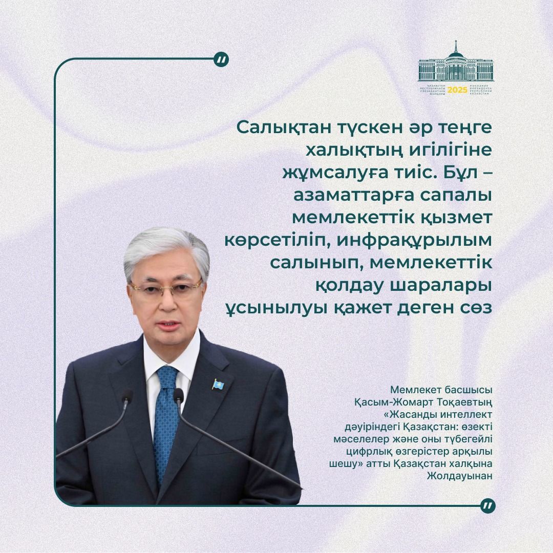 Осы тұрғыда Қазақстан халқына арналған Жолдау қоғамдағы өзекті мәселелерге нақты бағыт-бағдар береді. Мемлекет басшысы Жолдауда салықтан түскен әрбір теңге халықтың игілігіне қызмет етуі тиіс екенін атап өтті. Бұл сапалы мемлекеттік қызмет көрсету, инфрақұрылымды дамыту және әлеуметтік қолдау шараларын күшейтуді көздейді.
