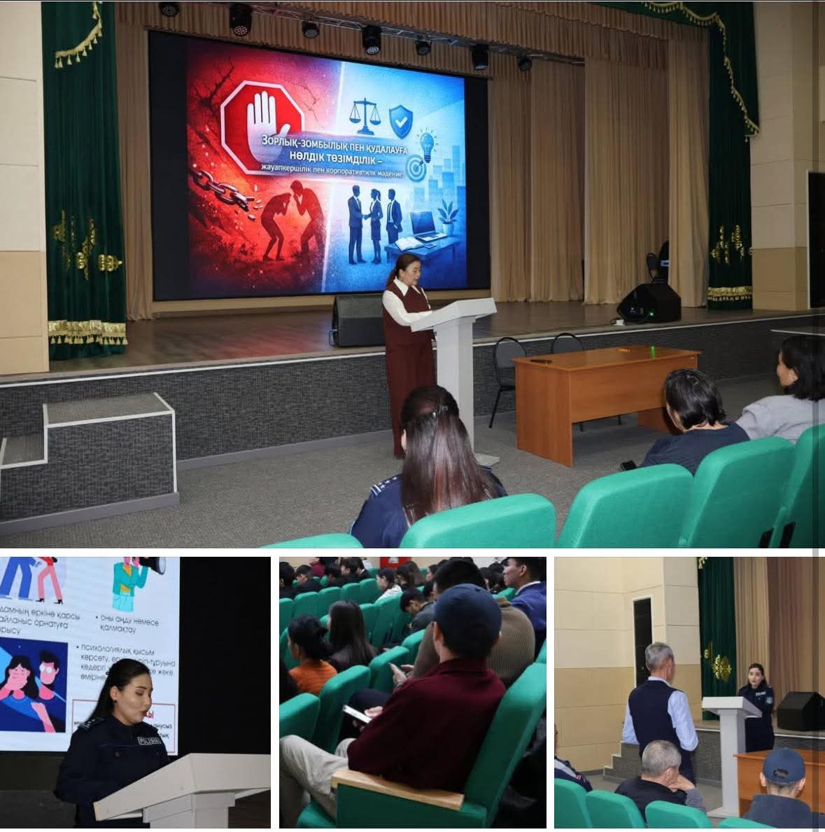Кездесу барысында полиция қызметкері тұрмыстық зорлық-зомбылықтың түрлері, сталкинг пен қудалаудың жауапкершілігі, заң аясындағы жазалар туралы кеңінен түсіндіріп өтті. Сонымен қатар, құқық бұзушылықтың алдын алу жолдары мен қиын жағдайға тап болған кезде қайда жүгіну керектігі жөнінде нақты ақпарат берілді.