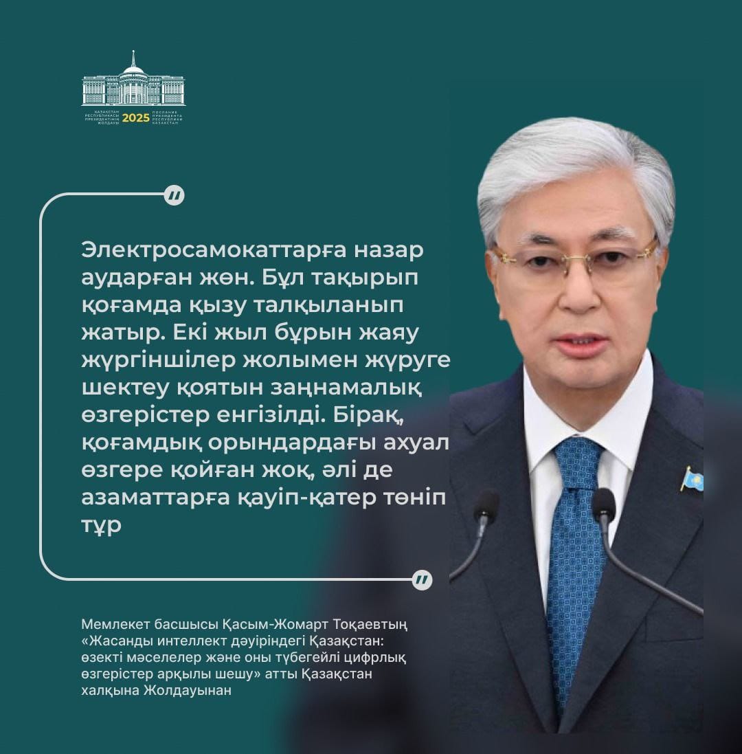 Мемлекет басшысының электросамокаттарды пайдалануға қатысты мәселені көтеруі – өте орынды қадам. Азаматтардың қауіпсіздігі мен қоғамдық тәртіп – ең басты құндылық.