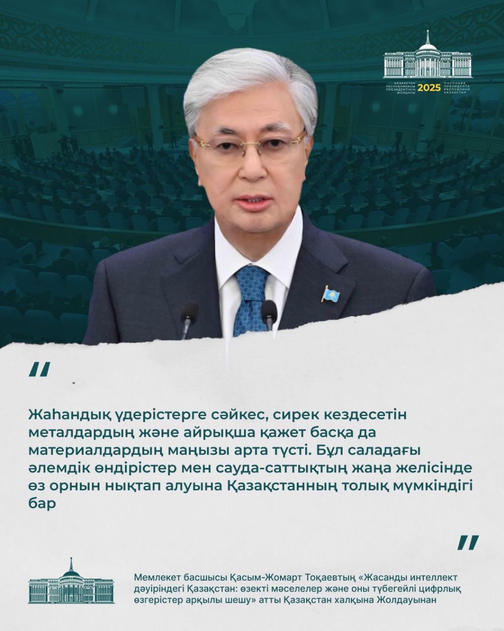Президенттің биылғы Жолдауында жаһандық өзгерістердің ел экономикасына әсері жан-жақты талданды. Әсіресе сирек кездесетін металдар мен стратегиялық материалдардың маңызы артып келе жатқаны атап өтілді. Бұл – жаңа экономикалық мүмкіндіктер дәуірінің белгісі.