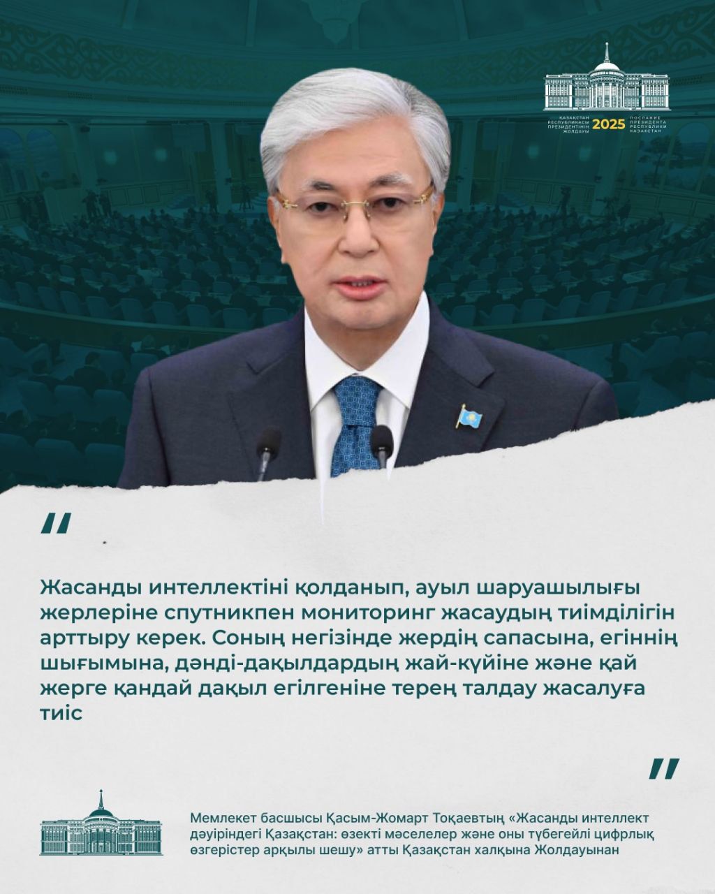 Мемлекет басшысы биылғы Жолдауында ауыл шаруашылығын дамытуда заманауи цифрлық технологиялардың, әсіресе жасанды интеллект пен спутниктік мониторингтің маңызын ерекше атап өтті. Бұл – аграрлық саланың тиімділігін арттырып, өнімділікті жаңа деңгейге шығаруға бағытталған нақты қадам.