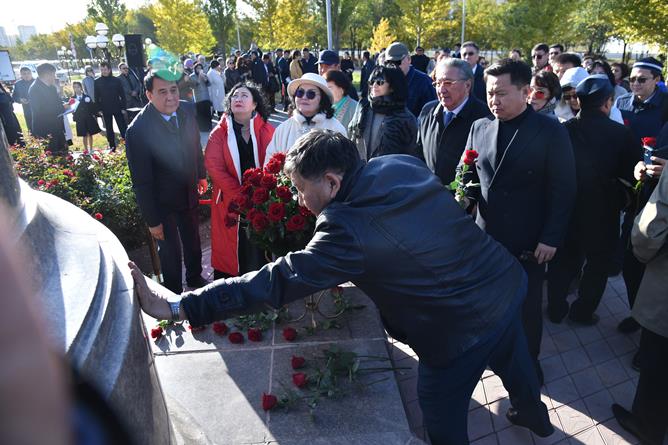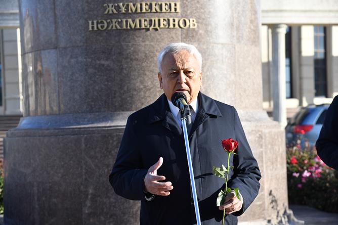 Атырауда Жұмекен Нәжімеденовтің ескерткішіне гүл шоқтары қойылды