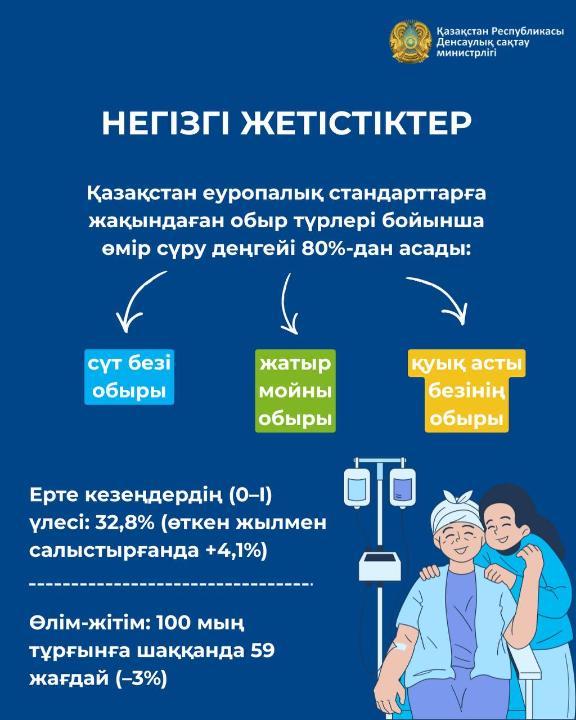 Қазақстанда онкологиямен ауыратын пациенттердің бес жылдық өмір сүру шегі алғаш рет 65%-ға жетіп, жоспарлы көрсеткіштен 58%-ға асып, соңғы жылдары үздік нәтижеге айналды.