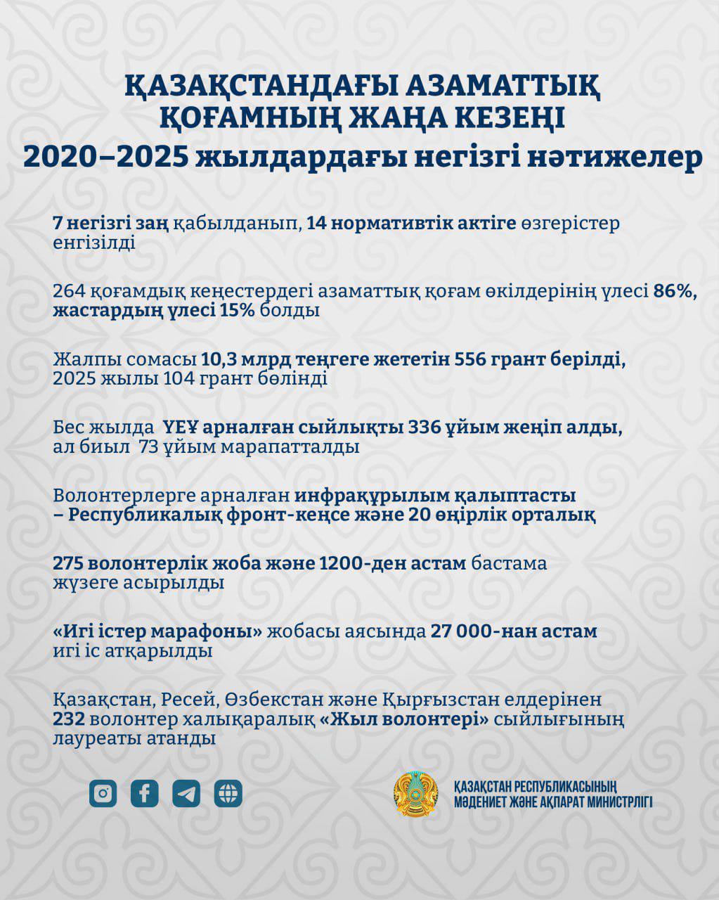 Соңғы бес жыл ішінде жалпы сомасы 10,3 млрд теңгені құрайтын 556 грант жүзеге асырылды. 2025 жылы жалпы құны 1,8 млрд теңге болатын 104 грант іске асырылуда. ҮЕҰ-ға арналған сыйлықақы конкурсы рекордтық нәтижеге қол жеткізіп, өтініштердің саны 135-тен 208-ге дейін артты. Ал, жеңімпаз ұйымдар саны 73-ке жетті. Олардың қатарында ауылдық аймақтардағы бастамалар мен инклюзивті жобалар да бар. Осы кезеңде барлығы 336 үкіметтік емес ұйым Мемлекеттік сыйлықақымен марапатталды.
