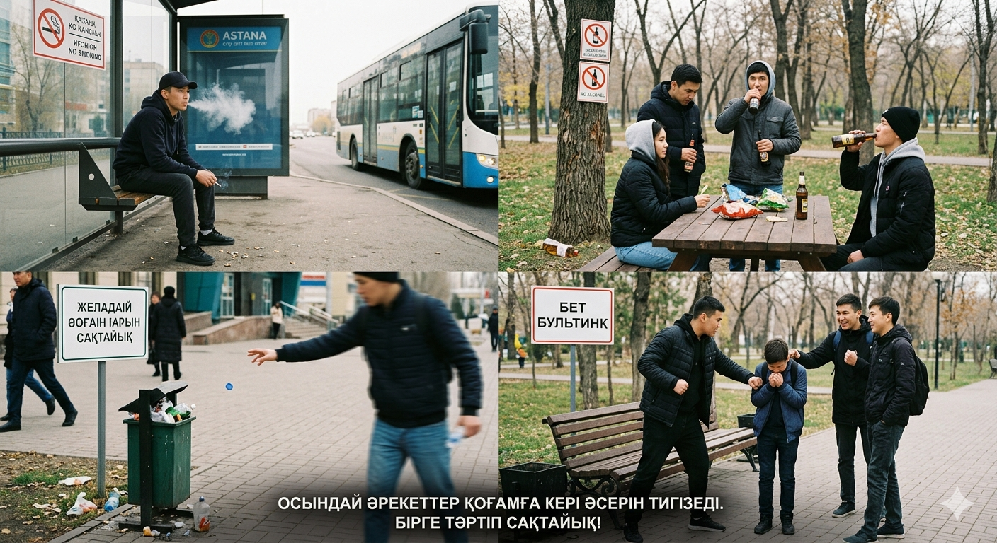 Көшеде, саябақта, аялдамаларда темекі тарту, ішімдік ішу, айналаны ластау, мүлікті сындыру, сондай-ақ буллинг жасау сияқты әрекеттер жиі кездеседі. Бұл тек заң бұзушылық қана емес, қоғам мәдениетінің төмендігін көрсететін жағымсыз құбылыс.