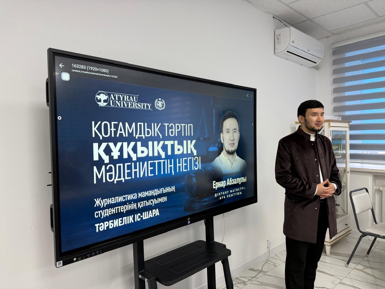 19 ақпан күні Х.Досмұхамедов атындағы Атырау университеті, Гуманитарлық ғылымдар және өнер факультетінің журналистика мамандығы студенттерінің қатысуымен «Қоғамдық тәртіп – құқықтық мәдениеттің негізі» тақырыбында тәрбиелік іс-шара ұйымдастырылып, мазмұнды форматта өтті. Кездесу студенттердің құқықтық сауаттылығын арттыруға, қоғамдық тәртіпті сақтаудың маңызын ұғындыруға және құқықтық мәдениетті қалыптастыруға бағытталды.