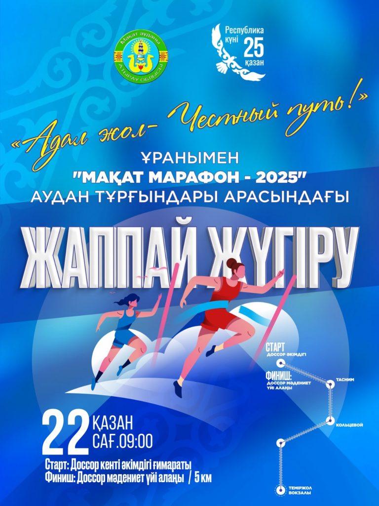 Республика күніне орай 22 қазан күні Мақат ауданы, Доссор кентінде “Адал жол — Честный путь!” ұранымен “Мақат марафон — 2025” атты аудан тұрғындары арасында жаппай жүгіру өтеді.